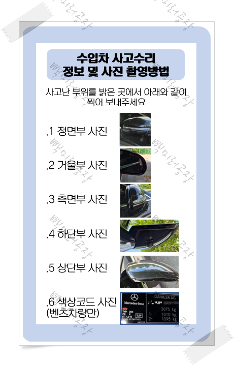 | 커버/깜빡이 손상 | 비용: 80만원 / 시간: 45일 | 비용: 15만원 / 시간: 1일 |