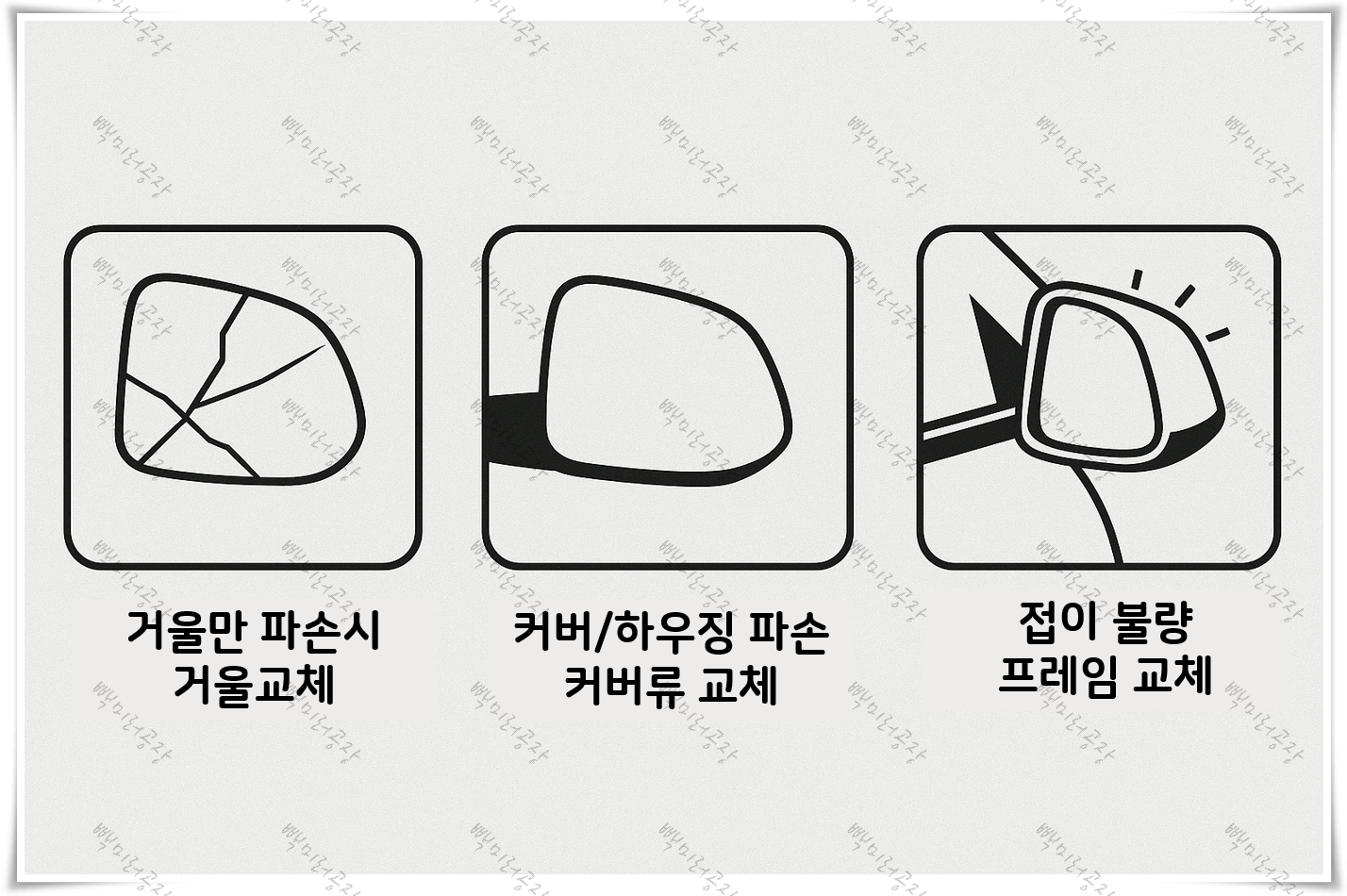 빽미러공장은 실제품 보유·부분 수리 노하우·6개월 보증으로 빠른 정상화를 돕습니다. 사진만 보내주시면 정확 진단 → 빠른 견적 → 예약까지 한 번에 도와드려요! 😊
