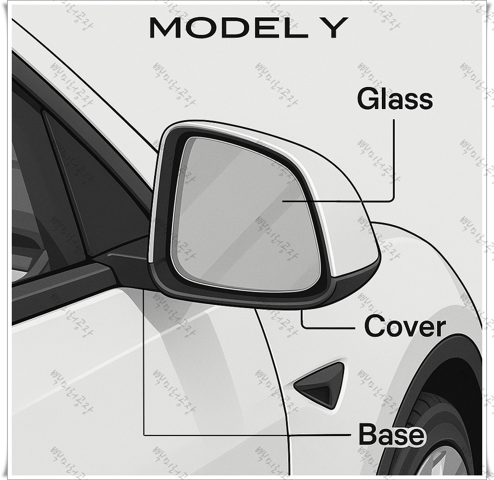테슬라 모델Y의 사이드미러(백미러)는 전동 접이, 열선, 오토디밍(일부 트림), 메모리 등 옵션 유무에 따라 구조와 가격이 달라집니다. 같은 "파손"이라도 깨진 유리만 바꾸느냐, 커버·프레임까지 손상되었느냐에 따라 견적 차이가 큽니다.