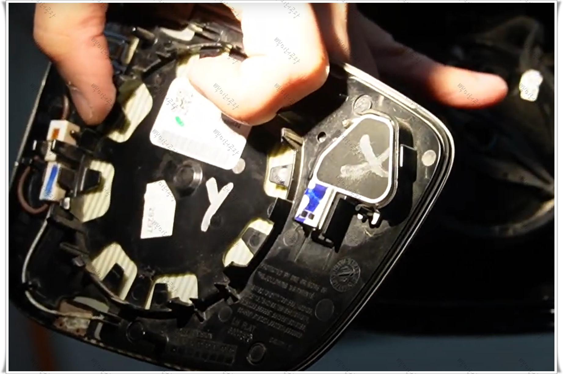 - 이미지 제안: 히팅 미러 유리 뒷면의 배선 연결단자가 보이는 분해 사진