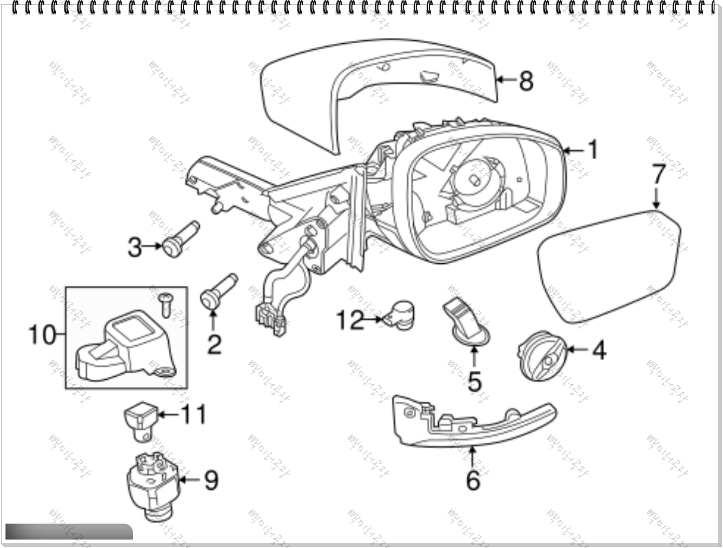 사이드미러는 일반적으로 다음 부품들로 구성됩니다: