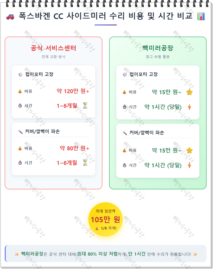 수입차 사이드미러 수리 전문업체 '빽미러공장'이 공식 센터 대비 최대 80% 이상 저렴하게, 그것도 단 하루 만에 폭스바겐 CC 사이드미러를 완벽하게 수리하는 '중고 부품 활용 꿀팁'을 아낌없이 공개합니다! 💡