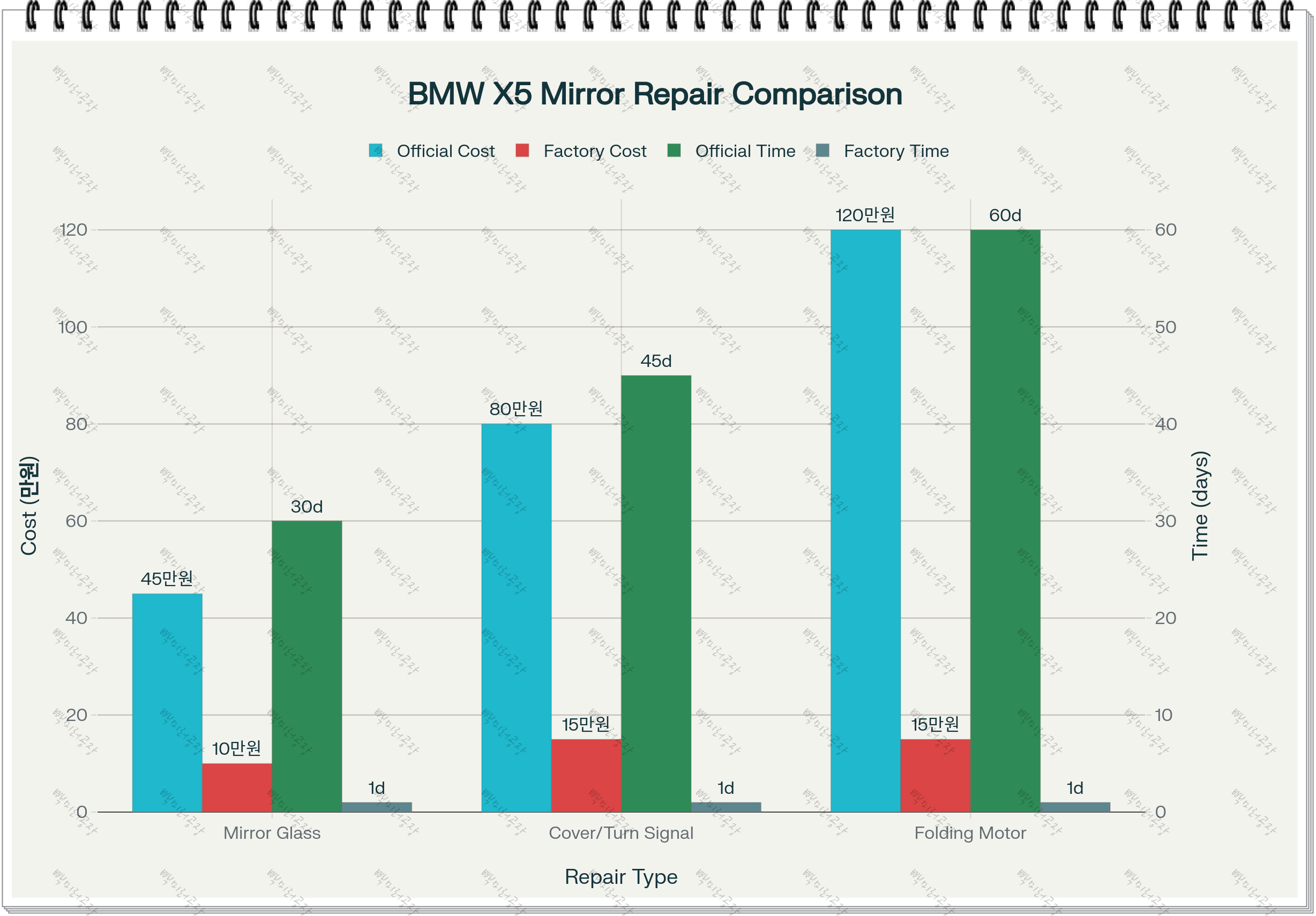 커버/깜빡이 파손: (공식 센터) 약 80만 원 / 45일 ➡️ (빽미러공장) 15만 원 / 1일
