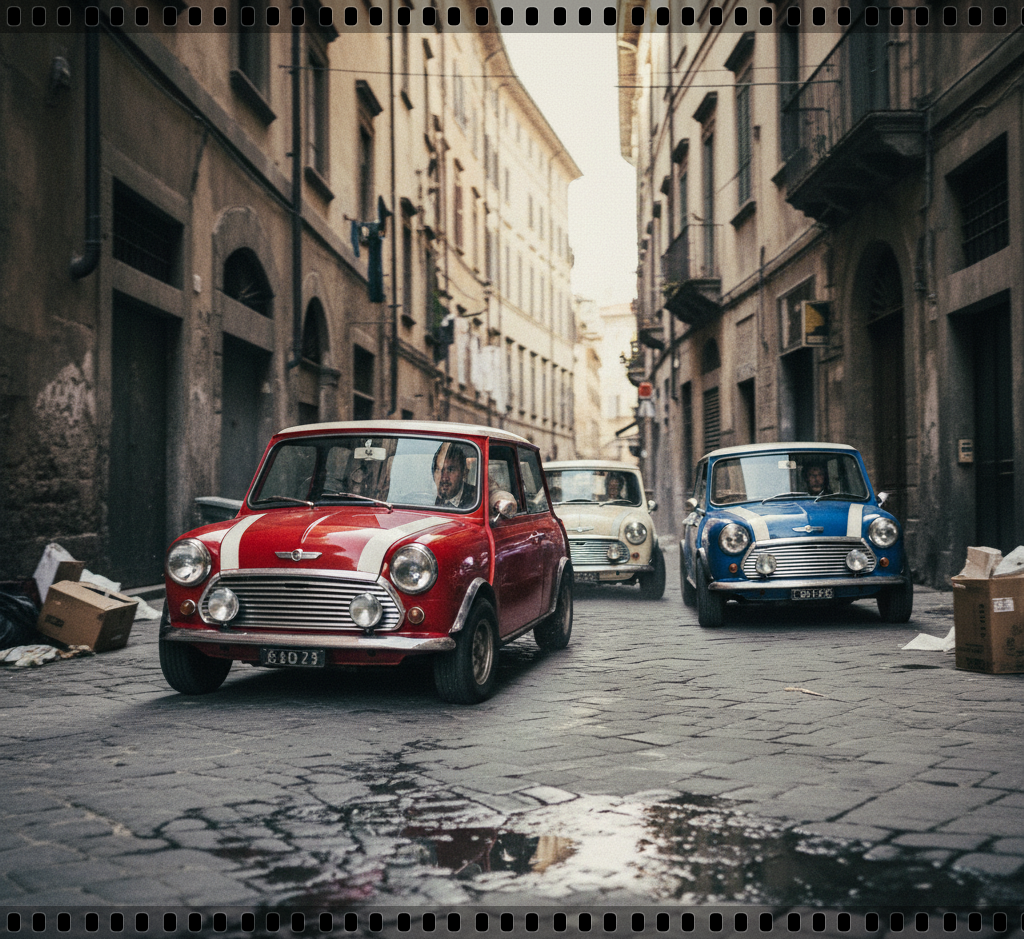 1969년 마이클 케인 주연의 영화 "이탈리안 잡(The Italian Job)"은 미니의 전설을 완성했습니다. 빨강, 흰색, 파랑 세 대의 미니가 이탈리아 토리노의 좁은 골목과 계단, 심지어 건물 내부를 질주하는 장면은 영화사에 길이 남을 명장면이 되었습니다.