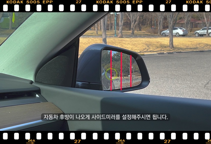 - 차체(내 차 옆면)가 미러에 살짝만 보이게: 미러의 안쪽 5~10% 수준