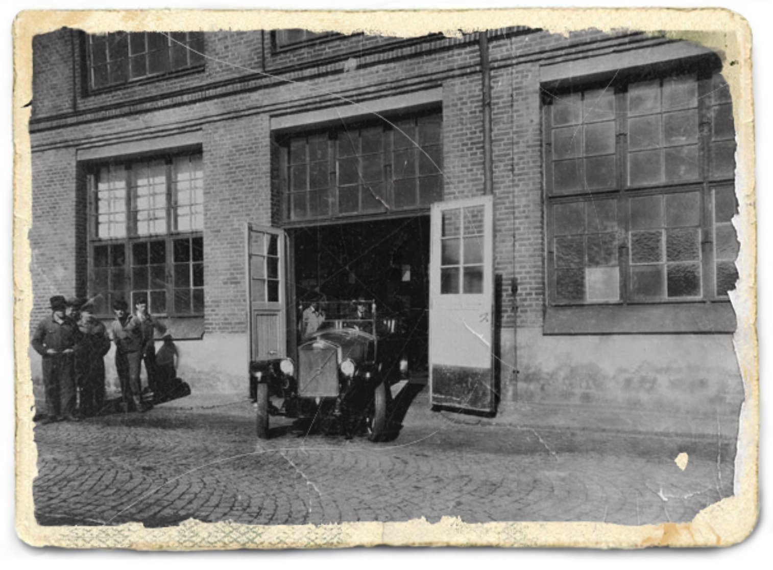 이미지 설명1: 1927년 볼보 최초의 자동차 ÖV4가 스웨덴 예테보리 공장 앞에 서 있는 모습. 오픈 투어러 스타일의 클래식한 차량으로 당시 스웨덴 자동차 산업의 시작을 상징.