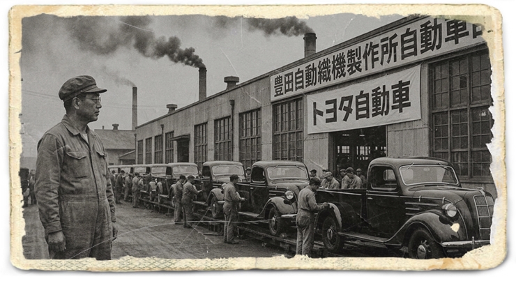 1930년대 토요타 공장 전경과 창업자 토요다 기이치로의 흑백 사진