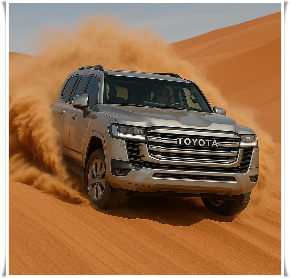 랜드크루저가 사막 모래언덕을 힘차게 오르는 장면
