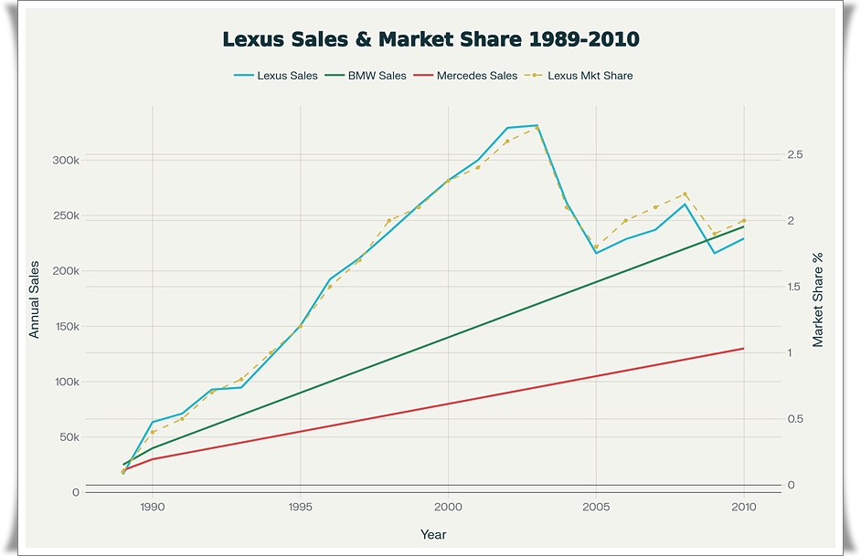 렉서스의 미국 시장 점유율 상승 그래프(1989-2010년), 벤츠/BMW와의 판매량 비교 차트