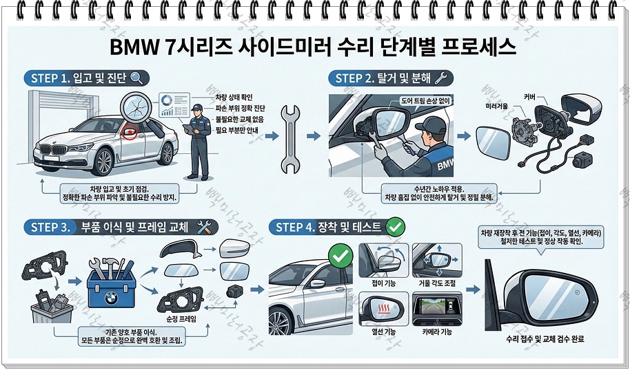 BMW 7시리즈 사이드미러가 파손되어 고민이신가요? 공식 서비스센터의 비싼 견적에 놀라셨다면, 이 글을 끝까지 읽어보세요. 수입차 사이드미러 수리 전문업체 빽미러공장이 합리적인 가격으로 완벽하게 수리하는 방법을 알려드립니다. 💡