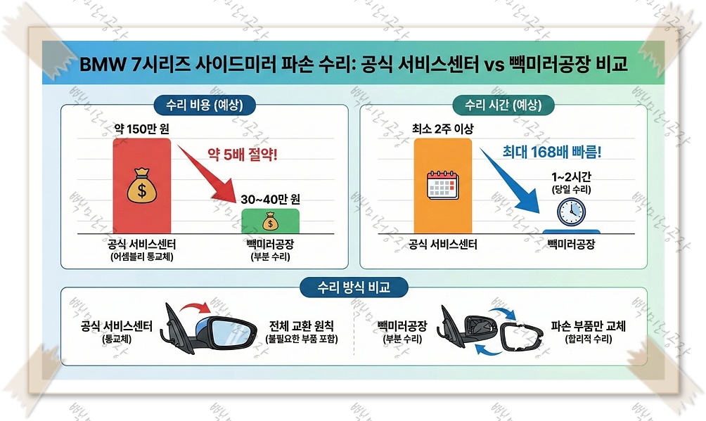 예를 들어, 공식 센터에서 150만 원이 나오는 수리를 빽미러공장에서는 30~50만 원대에 해결할 수 있습니다. 💰