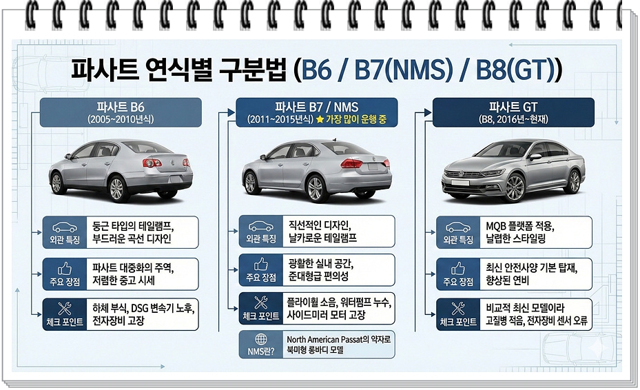 파사트의 고질병을 정확히 파악하려면 먼저 내 차량의 정확한 세대를 아는 것이 중요합니다. 부품 호환성과 고장 패턴이 세대별로 다르기 때문입니다.