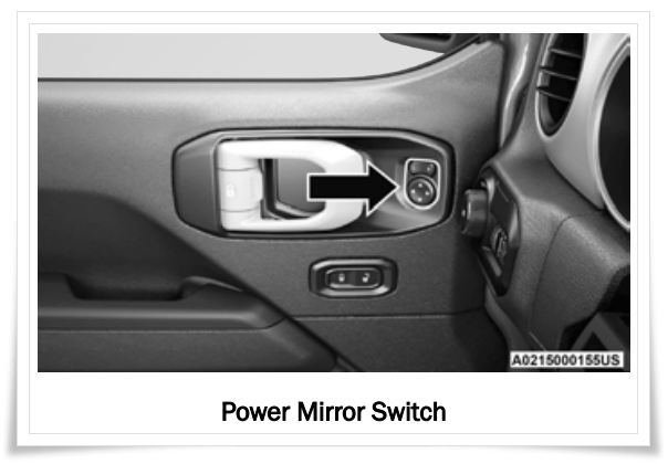 2025년형 지프 랭글러의 전동 미러 조절 스위치는 운전석 도어 패널 상단에 위치해 있습니다. 손이 쉽게 닿는 곳에 있어 직관적으로 사용할 수 있죠.