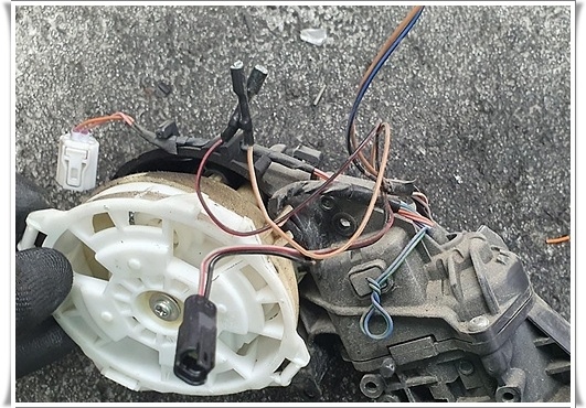 사이드미러 모터 내부의 마모된 플라스틱 기어 근접 사진