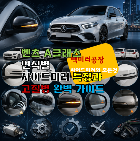 메르세데스-벤츠 A클래스를 소유한 오너라면 누구나 한 번쯤은 사이드미러 이상을 경험합니다. 접힐 때 나는 이상한 소리, 작동 중 멈춤, 거울 떨림 현상까지. 이 글에서는 3세대(W176)와 4세대(W177)의 연식별 사이드미러 구조와 기능적 차이를 비교하고, 반복적으로 발생하는 고질병의 정확한 원인과 합리적인 해결 방법을 전문가 시각에서 상세하게 안내해 드립니다.