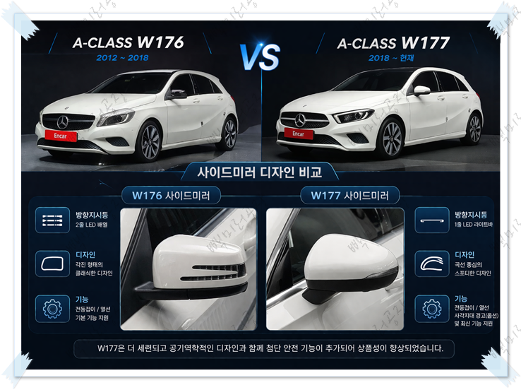 - 3세대(W176) vs 4세대(W177) 연식별 사이드미러 특징 비교