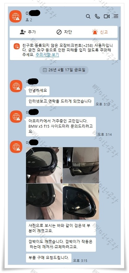 오늘은 저희가 직접 경험한 특별한 부품 판매 사례를 소개해 드립니다. 멀리 아프리카 현지에서 BMW X5(F25) 차량을 운행하시던 고객님이 카카오톡으로 긴급 연락을 주셨습니다. 파손 부위는 사이드미러의 속커버(내부 프레임)와 LED 깜박이(리피터)로, 현지에서는 정품 부품 수급 자체가 어렵고 수리비용도 국내 대비 훨씬 높은 상황이었습니다.