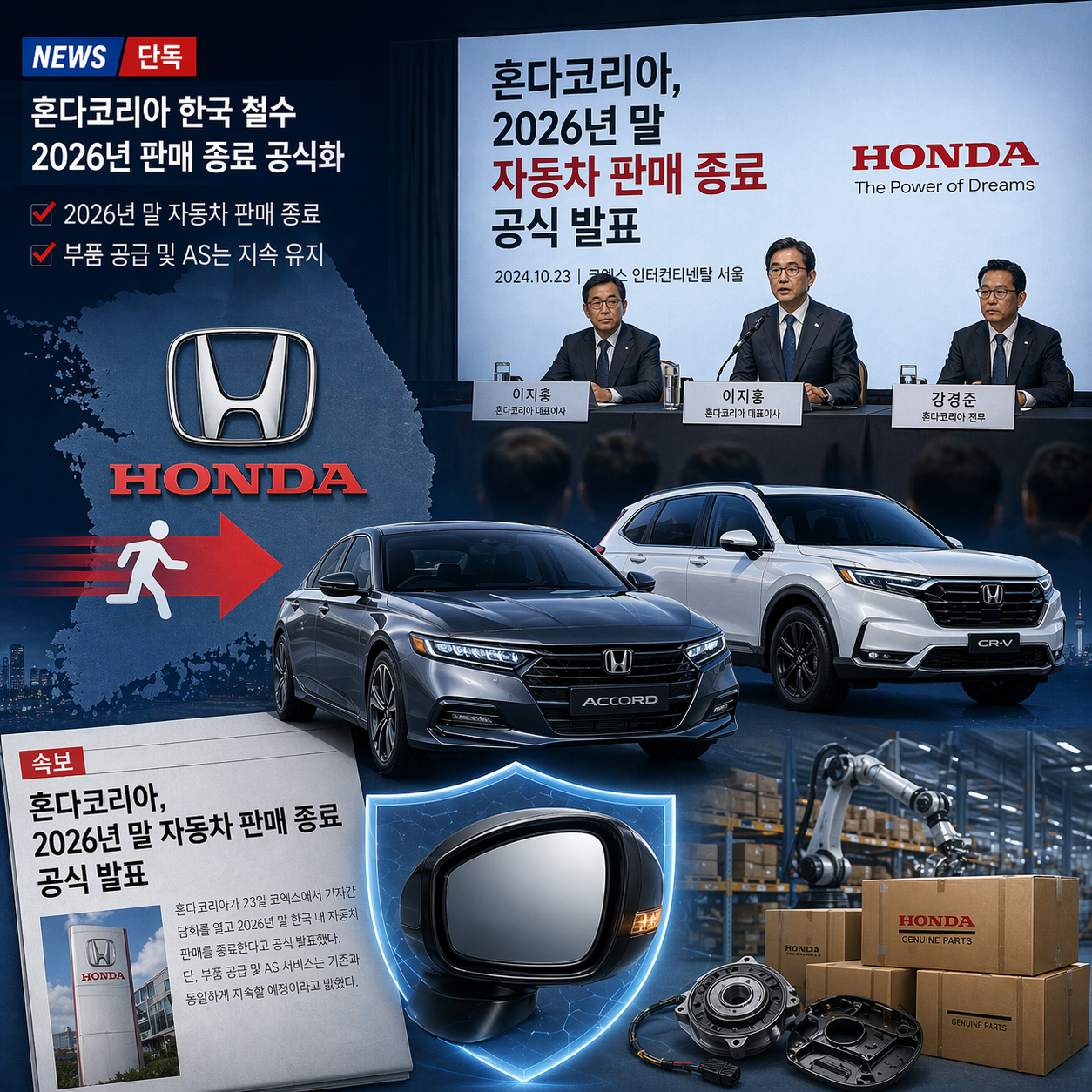혼다코리아가 2026년 말 자동차 판매를 공식 종료한다고 발표했습니다. 수십만 명의 혼다 차주들이 가장 먼저 걱정하는 것은 단 하나, "내 차 수리 부품, 앞으로도 구할 수 있을까?" 입니다. 특히 접촉 사고 시 가장 빈번하게 교체하는 사이드미러 부품에 대한 불안이 커지고 있는데요. 빽미러공장은 혼다 차주분들의 이런 걱정을 앞서 파악하고, 혼다 전 차종 사이드미러 부품 재고 선제 확보에 나섰습니다. 지금부터 혼다 철수 일정부터 사이드미러 수급 현황, 차주 대응 방법까지 모두 정리해 드립니다.