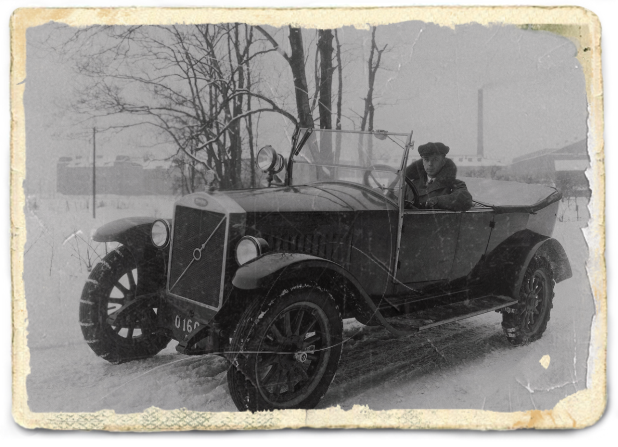 이미지 설명1: 1927년 볼보 최초의 자동차 ÖV4가 스웨덴 예테보리 공장 앞에 서 있는 모습. 오픈 투어러 스타일의 클래식한 차량으로 당시 스웨덴 자동차 산업의 시작을 상징.