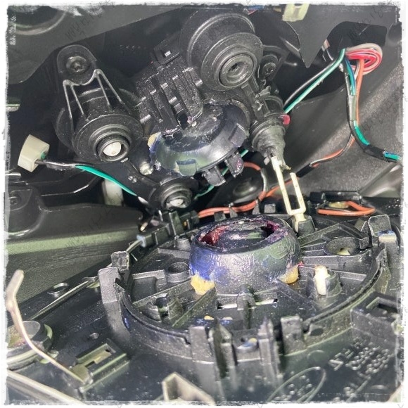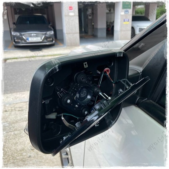 수리는 기존 파손된 모터를 추출하는 것에서 시작합니다. 거울을 안전하게 탈거한 뒤, 내부 프레임에 고정된 고장 난 모터를 제거합니다. 이 과정에서 가장 중요한 것은 거울에 연결된 열선 배선과 측후방 경보 시스템(BLIS) 배선이 손상되지 않도록 정밀하게 작업하는 것입니다.
