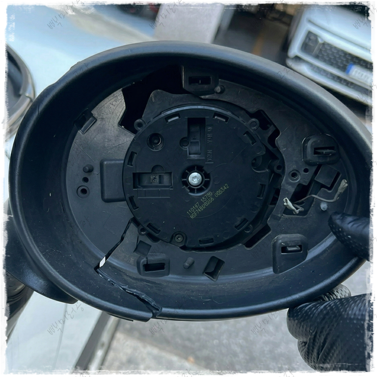 미니 컨트리맨은 차체 밖으로 크게 돌출된 사이드미러 구조를 갖고 있습니다. 개성 있는 디자인의 장점이지만, 좁은 골목길 주행이나 주차 중 장애물과 충돌하기 쉬운 구조이기도 합니다. 충격을 받으면 외부 커버나 거울 유리는 멀쩡한 경우라도, 내부 지지 구조물인 알루미늄 합금 프레임(목부분)이 뚝 부러지며 미러 전체가 덜렁거리는 상태가 됩니다.