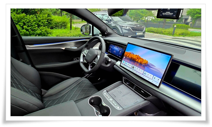 씨라이언 7의 실내는 '테크 럭셔리'라는 키워드로 압축됩니다. 가장 눈에 띄는 요소는 15.6인치 회전형 센터 터치스크린으로, 내비게이션 사용 시에는 가로 모드로, 영상 콘텐츠 시청 시에는 세로 모드로 자동 전환됩니다. 2,930mm의 넉넉한 휠베이스는 뒷좌석 탑승자에게 준대형급 레그룸을 제공하며, 기본 트렁크 용량 500리터는 2열 완전 폴딩 시 최대 1,769리터까지 확장되어 가족 여행이나 캠핑 용도로도 충분합니다. 여기에 통풍·열선 시트, 헤드업 디스플레이(HUD), 파노라믹 선루프 등 고급 편의 사양이 기본으로 탑재됩니다.